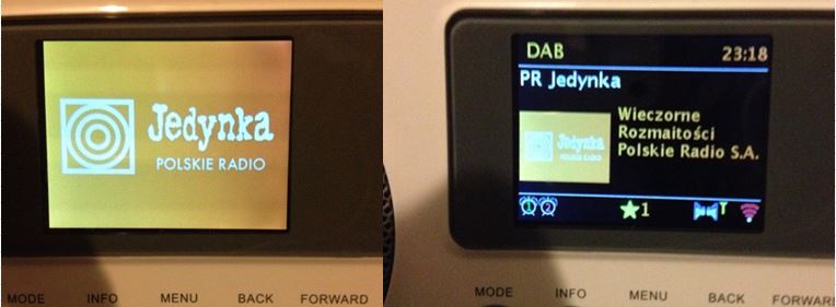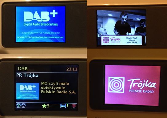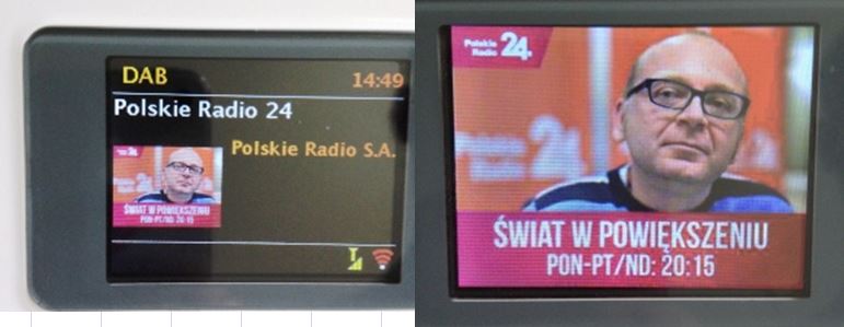 Wraz z dźwiękiem pojawiają się obrazki. Jedynka, Dwójka i Czwórka – same logo, Trójka – slajd logo stacji, reklamy i zapowiedzi graficzne wybranych programów oraz reklama strony internetowej nt DAB+ Radio Rytm zobaczymy slajd okładki płyt granych utworów. Nie do końca wyświetlane w czasie, ogólnie slajd granego utworu pojawia się dopiero w 1/3 nadawanej piosenki (przynajmniej tak jest u mnie) znacznie wcześniej opis PR24 – logo stacji i zdjęcie zapowiedzi programu. Radio Dzieciom oraz Radio Poland nie nadają wersji graficznej.